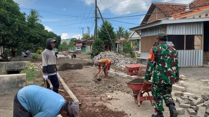Babinsa Koramil 0825-11/Pesanggaran Gotong Royong Kerja Bakti Pavingisasi Jalan Desa Bersama Warga Masyarakat