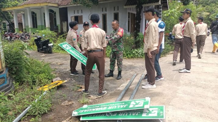 Anak-anak Pramuka dengan penuh antusias membantu pemasangan papan petunjuk, sementara warga turut memastikan posisinya tepat dan mudah terlihat.