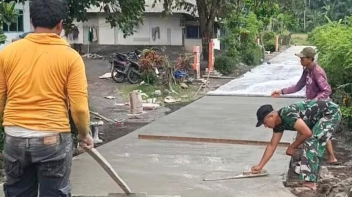 Semangat gotong royong antara Satgas TMMD ke-126 dan masyarakat Dusun Krajan 1A terus mengalir dalam pengerjaan rabat beton