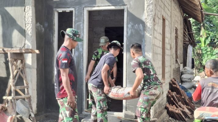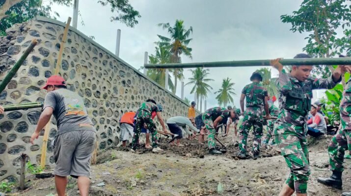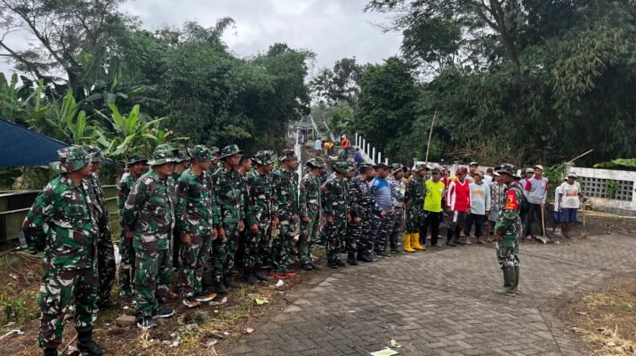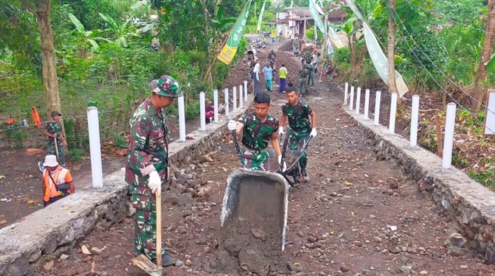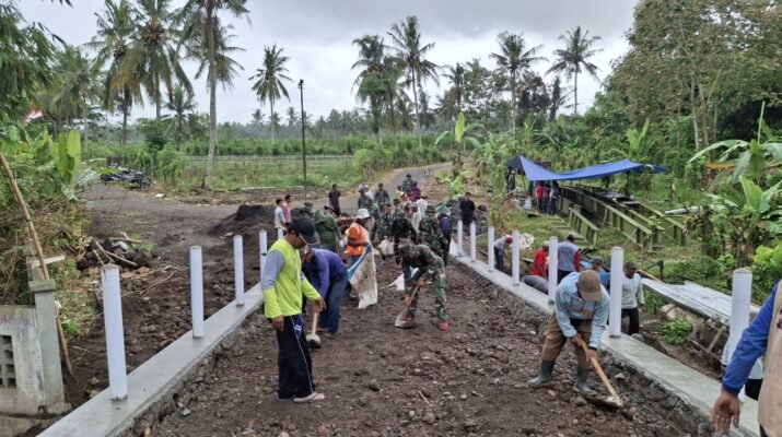 Banyuwangi – Pemandangan penuh semangat kebersamaan terlihat di Desa Kesilir, Kecamatan Siliragung, Kabupaten Banyuwangi. Anggota Satuan Tugas (Satgas) TNI Manunggal Membangun Desa (TMMD) bersama